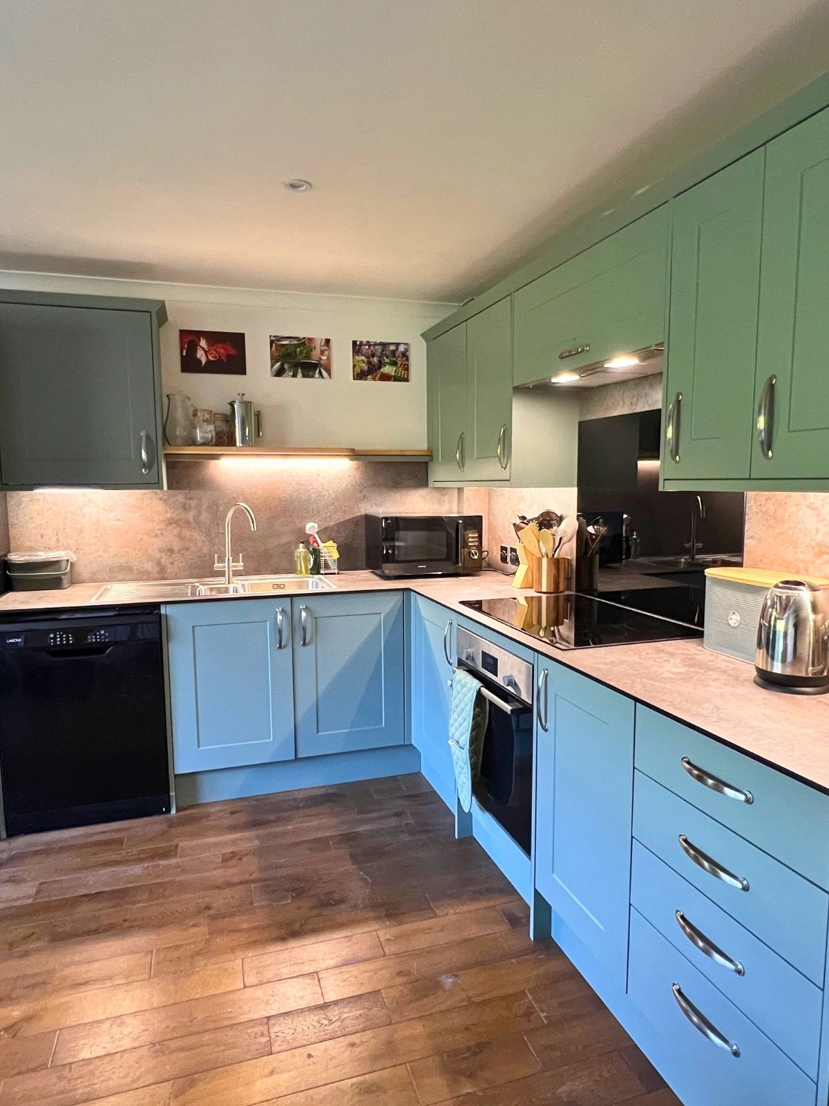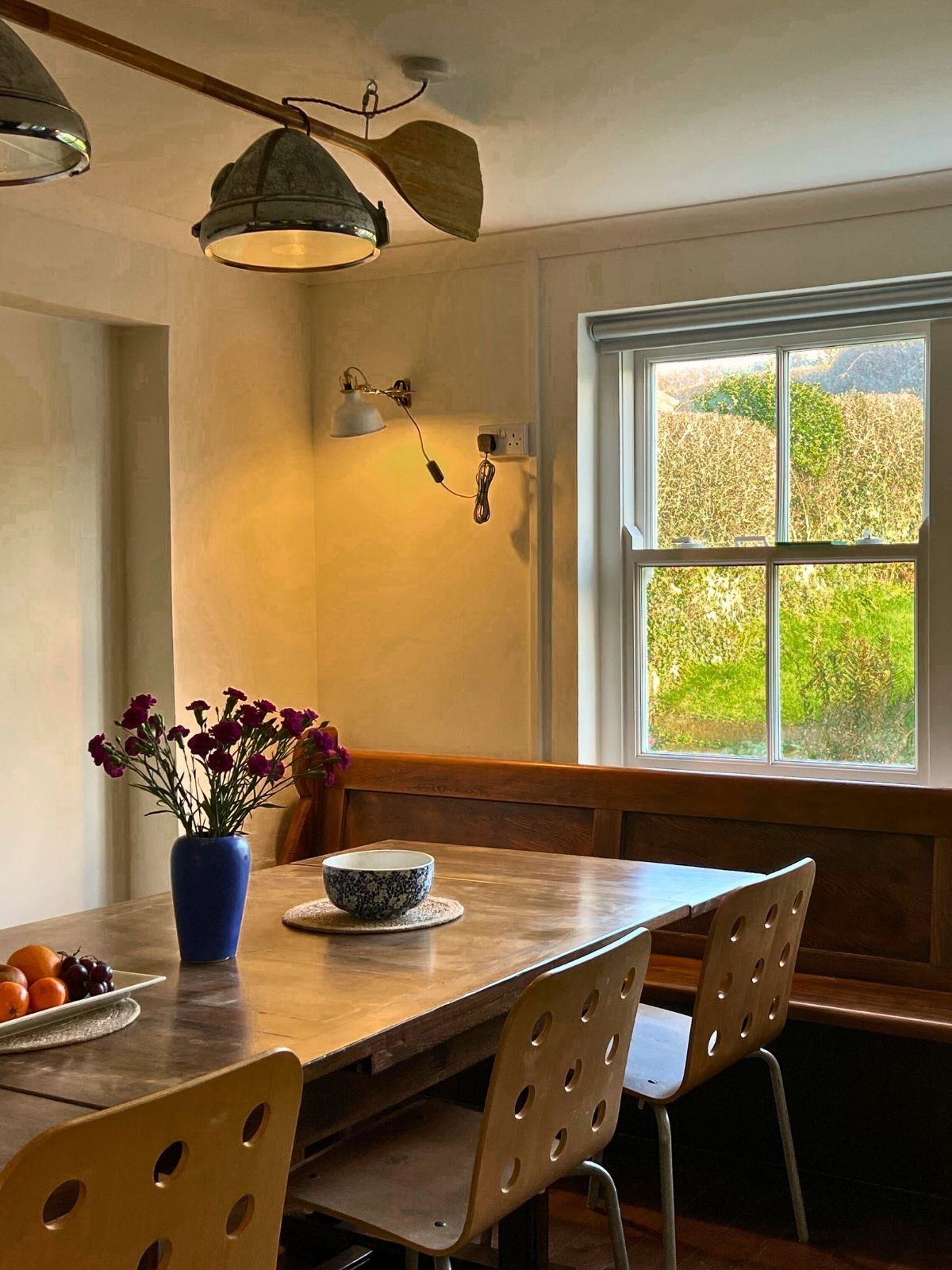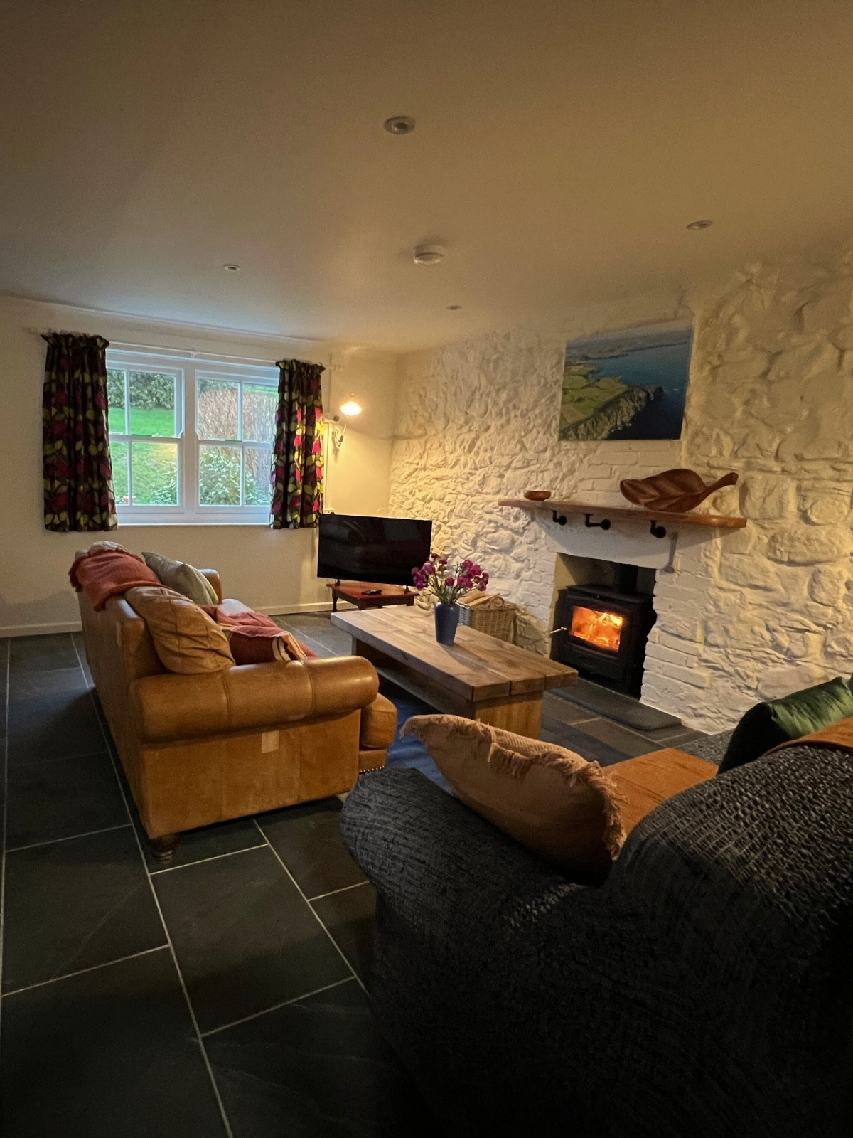 The living room is made for easy company: a traditional wood-burning stove, two generous leather sofas and a characterful old Welsh “settle”. This is a cosy place for stories, board games and unwinding after the day’s adventures. Wi-Fi runs throughout and the Smart TV is ready for cosy movie nights.